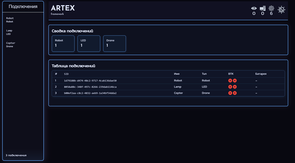 - Сводка подключений – пиктограммы с названиями типов устройств (Robot, LED, Drone). Позволяют быстро оценить, какое оборудование находится в сети.