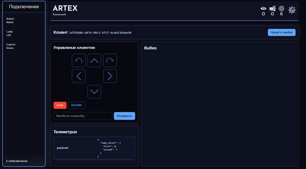 ARTEX framework - это программная платформа для удалённого управления, мониторинга и интеграции разнородных устройств: простые светодиодные лампы, роботы и дроны. Она предоставляет единый веб-интерфейс, через который оператор может видеть состояние всех подключённых устройств, отдавать им команды и получать телеметрию в реальном времени.