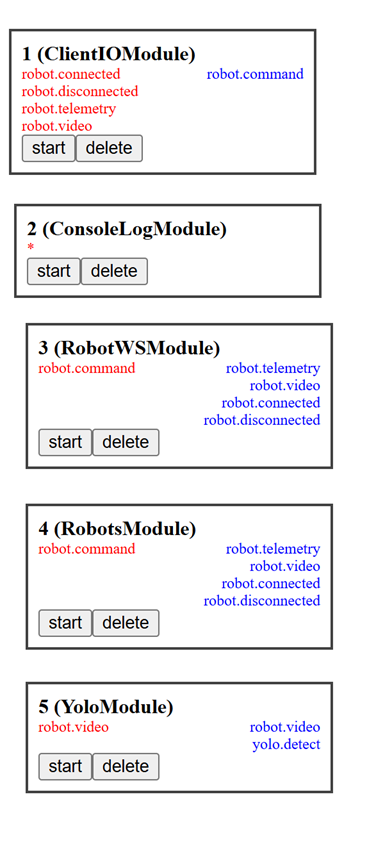 Назначение: предположительно управляет списком всех подключённых роботов или агрегирует данные от нескольких устройств. По набору портов идентичен RobotWSModule, но может выполнять более высокоуровневые функции, например, объединение потоков от нескольких роботов или ведение реестра подключений.