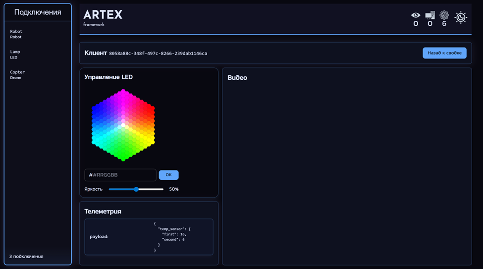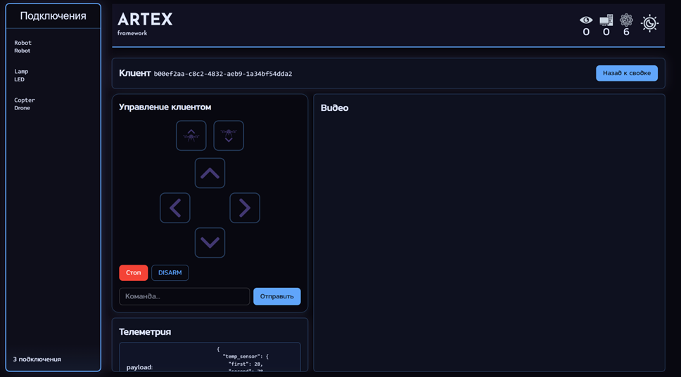 ARTEX framework - это программная платформа для удалённого управления, мониторинга и интеграции разнородных устройств: простые светодиодные лампы, роботы и дроны. Она предоставляет единый веб-интерфейс, через который оператор может видеть состояние всех подключённых устройств, отдавать им команды и получать телеметрию в реальном времени.